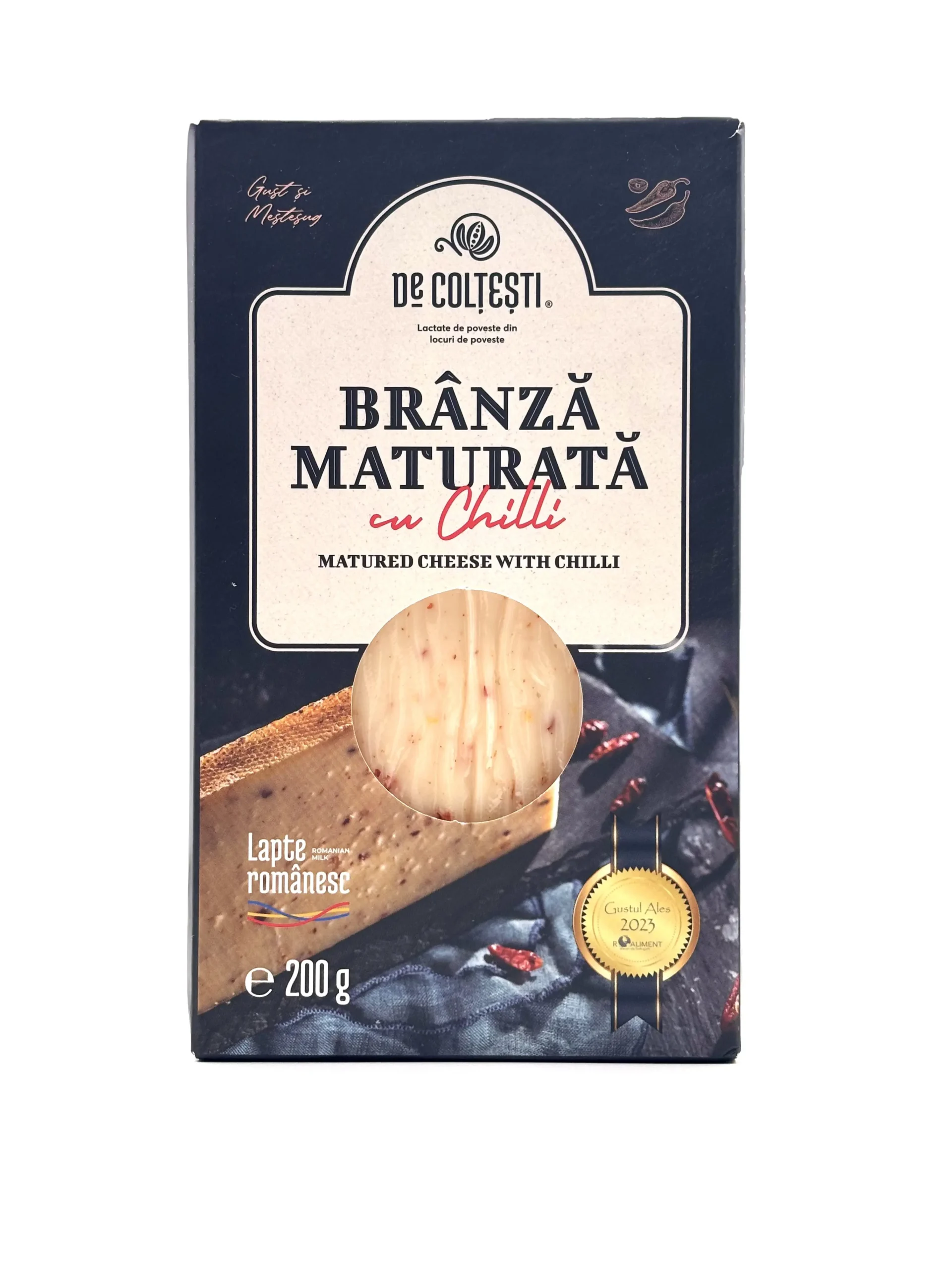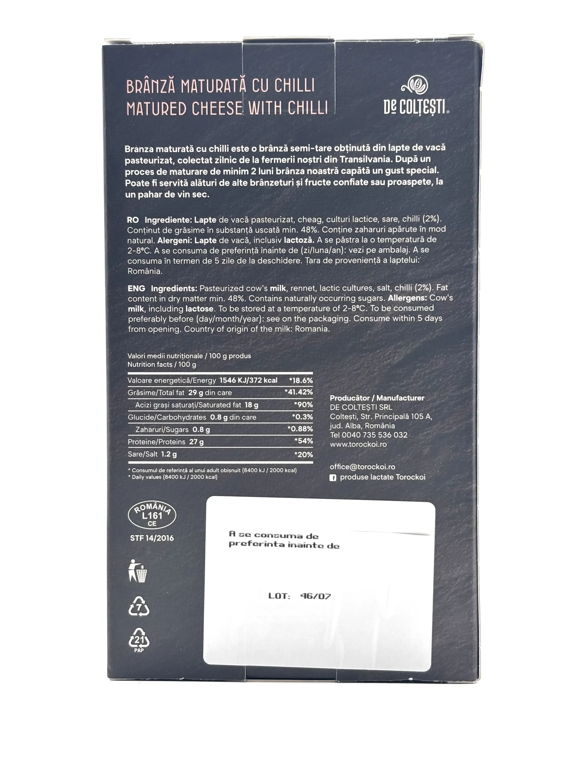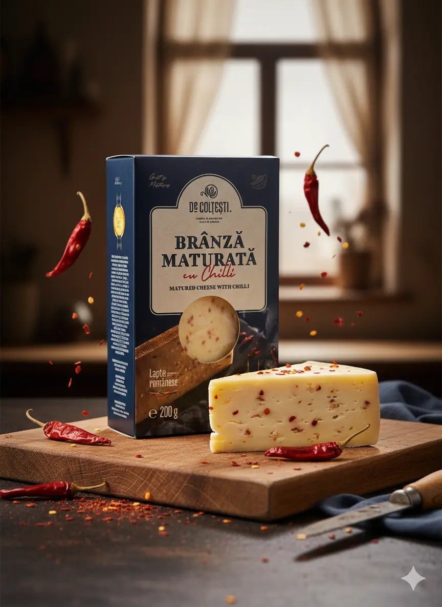 Producator: De Coltesti, Ingrediente principale: Lapte de vaca pasteurizat, cheag, culturi lactice, sare, chilli, Tip produs: Branza maturata cu chilli, Gramaj: 200g, Textura: Ferma, usor elastica, Aroma: Picanta, usor afumata, intensa, 100% natural: Da, Fara conservanti: Da, Mod de consum: Ideala pentru platouri de branzeturi, sendvisuri, gustari, preparate la cuptor, Beneficii: Sursa de proteine si calciu, aroma bogata, efect revigorant datorita chilli-ului