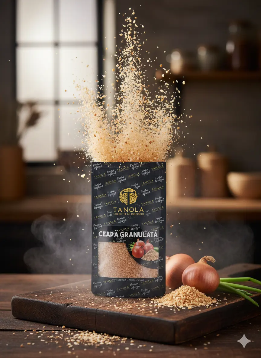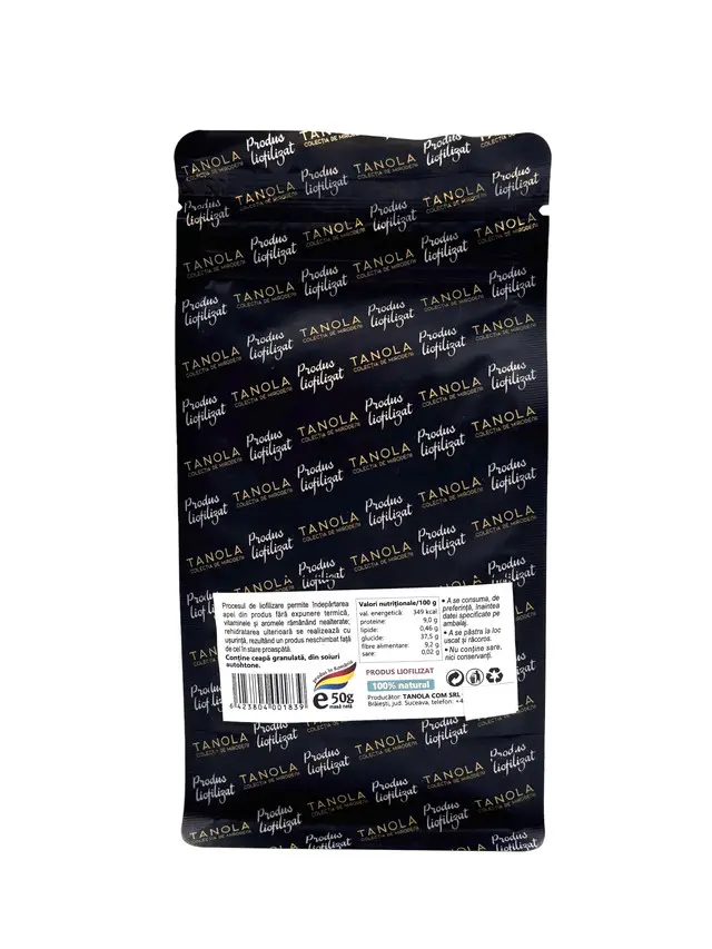 Producator: Tanola, Ingrediente principale: Ceapa granulata, Tip produs: Ceapa granulata, Gramaj: 50 g, Procesare: Uscata si maruntita fin, Fara aditivi: Da, 100% natural: Da, Aroma: Intensa, dulceaga, specifica cepei uscate, Utilizare: Potrivita pentru supe, sosuri, tocane, marinade, dressinguri si preparate la cuptor, Beneficii: Bogata in antioxidanti, sustine imunitatea, ajuta digestia