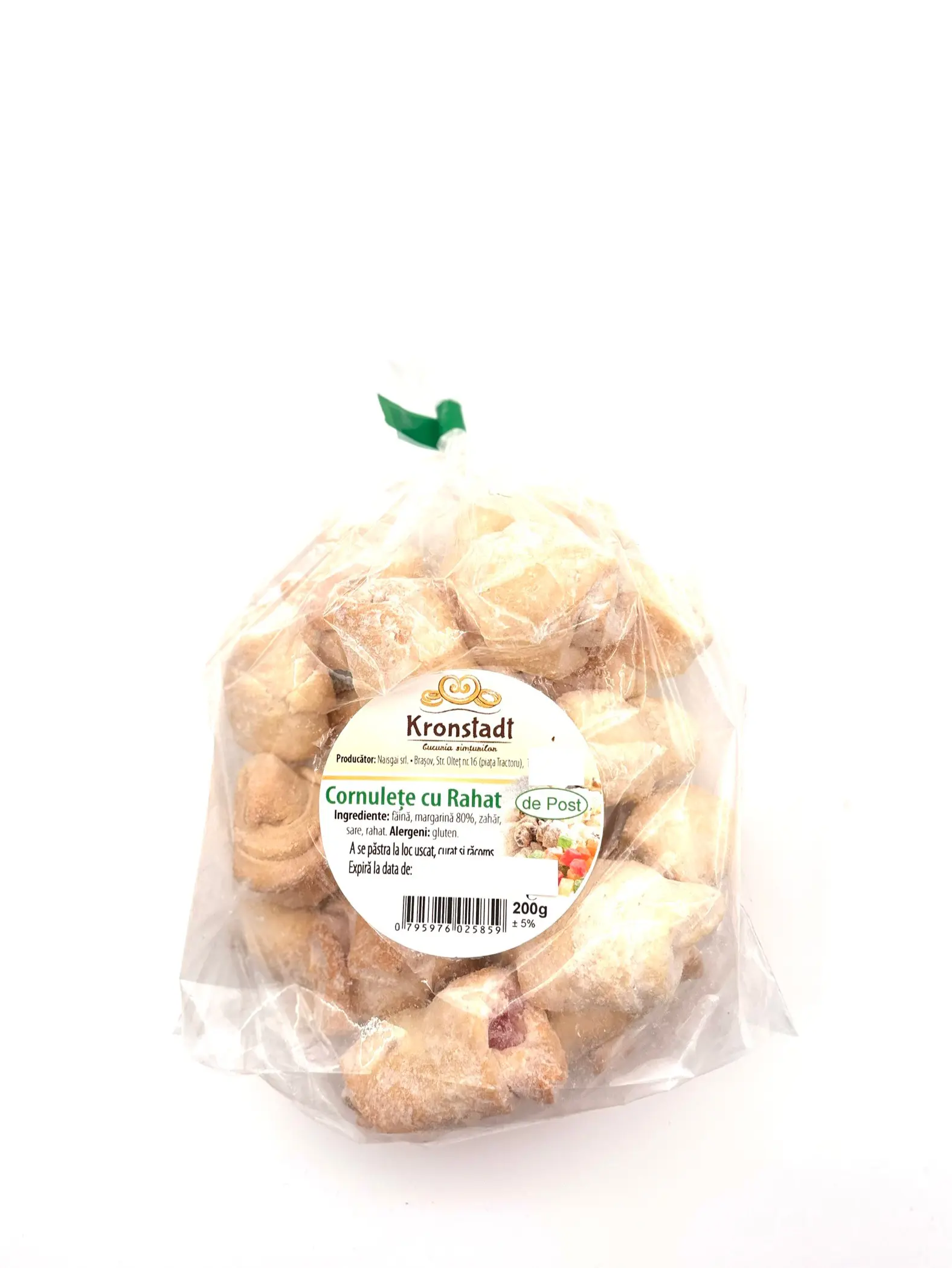 | Cornulete cu rahat Kronstadt | Producator: Kronstadt, Ingrediente principale: faina, untura, zahar, smantana, ou, sare, rahat, Tip produs: cornulete cu rahat, Gramaj: 200g, Fara conservanti: da, Fara arome artificiale: da, 100% natural: da, Indulcit natural: da (cu zahar), Potrivit pentru: desert traditional, gustare dulce, Textura: frageda, fina, Aroma: delicata, cu umplutura dulce de rahat, Beneficii: reteta traditionala, gust autentic, ingrediente naturale |