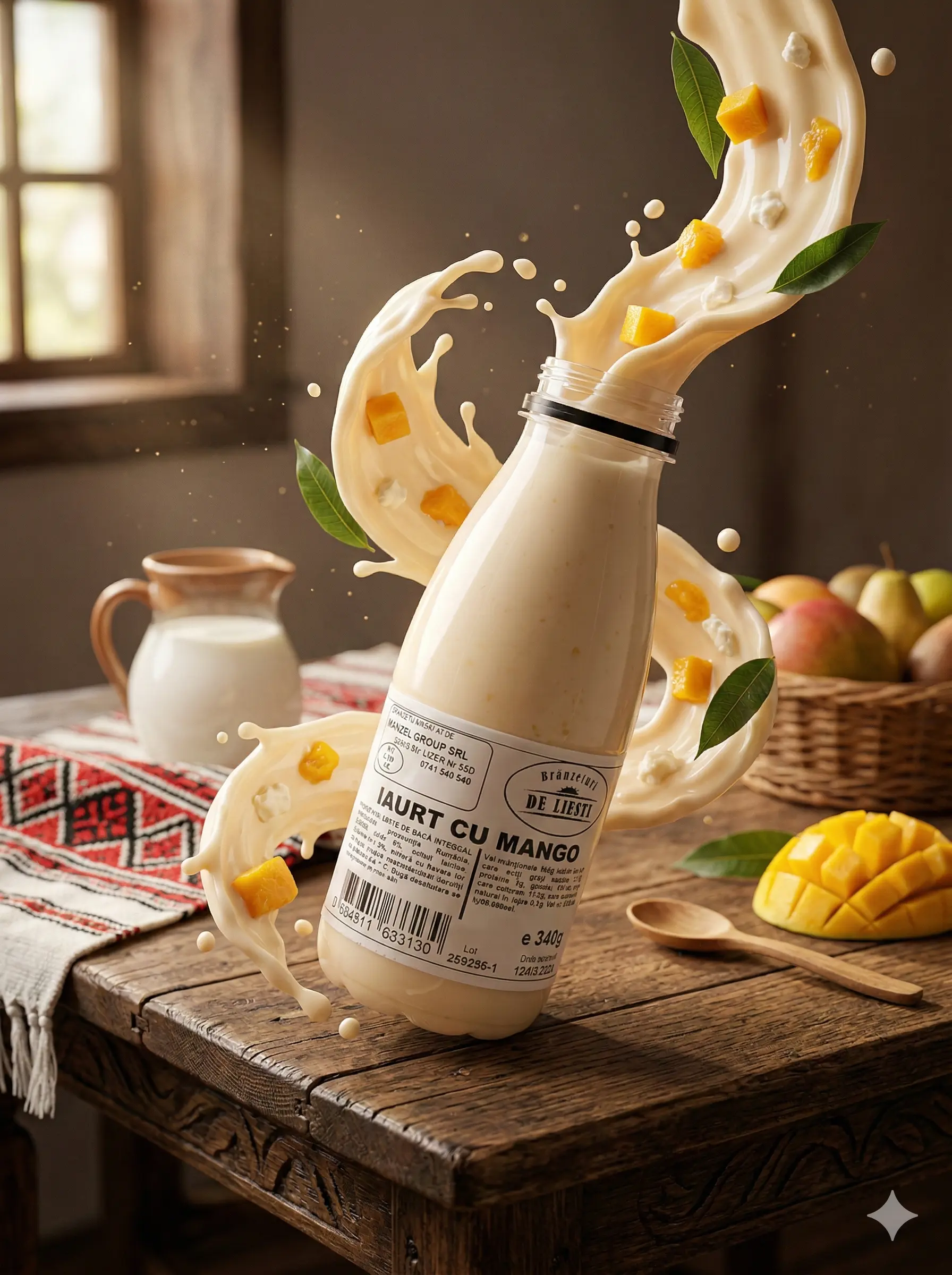 Producator: De Liesti, Ingrediente principale: Lapte de vaca integral, pasteurizat, mango, zahar, culturi lactice, Tip produs: Iaurt cu fructe, Gramaj:340g, 100% natural: Da, Fara conservanti: Da, Textura: Crema fina, consistenta omogena, Aroma: Dulce-acrisoara, cu note exotice de mango