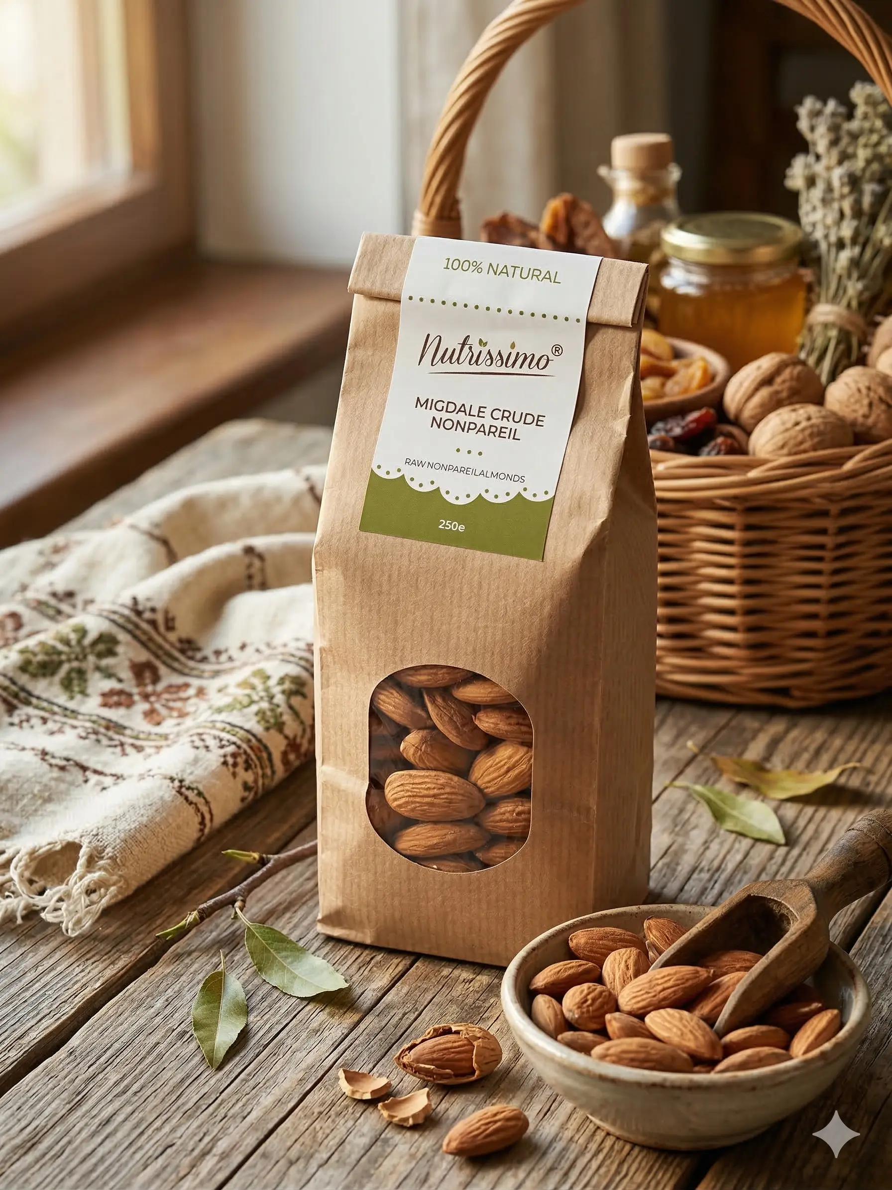 | Migdale crude Pravalia Noastra | Producator: Pravalia Noastra, Ingrediente principale: Migdale crude, Tip produs: Migdale crude, neprocesate, Gramaj: 200 g, 100% natural: Da, Fara aditivi: Da, Fara conservanti: Da, Procesare: Neprajite, nesarate, Aroma: Gust natural de migdale, usor dulceag, Textura: Crocanta, Mod de consum: Consum ca atare, in cereale, iaurt, smoothie-uri, prajituri sau preparate culinare, Beneficii: Bogate in proteine, fibre, grasimi sanatoase, vitamina E si antioxidanti |