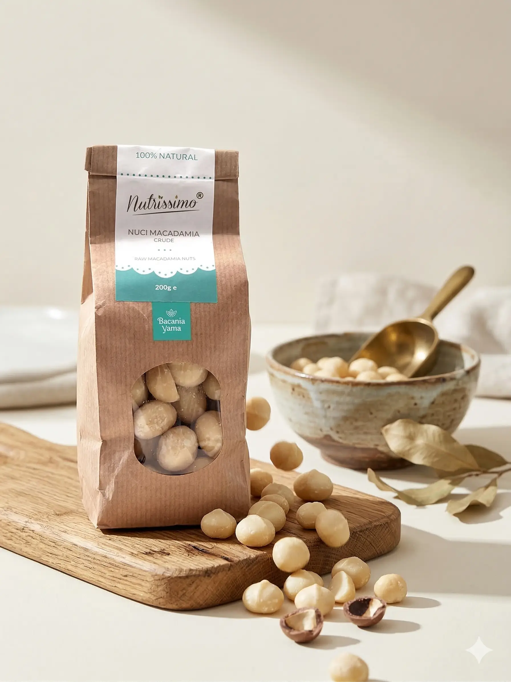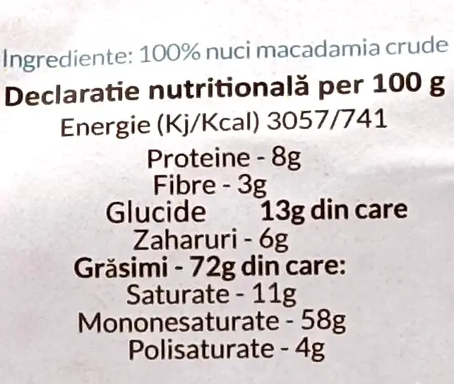 | Nuci Macadamia crude Pravalia Noastra | Producator: Pravalia Noastra, Ingrediente principale: Nuci Macadamia crude, Tip produs: Nuci Macadamia crude, neprocesate, Gramaj: 200 g, 100% natural: Da, Fara aditivi: Da, Fara conservanti: Da, Procesare: Neprajite, nesarate, Aroma: Gust cremos, usor dulceag, specific nucilor Macadamia, Textura: Crocanta la exterior, untoasa la interior, Mod de consum: Consum ca atare, in deserturi, smoothie-uri, salate, unt de nuci, preparate culinare, Beneficii: Bogate in grasimi sanatoase, antioxidanti, fibre si minerale esentiale |