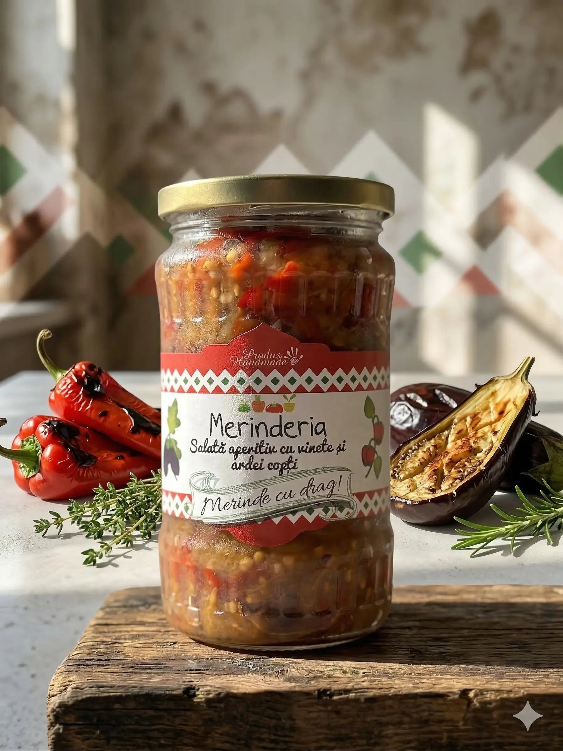 Producator: Merinderia, Ingrediente principale: Vinete coapte, ardei copti, ulei, otet, zahar, sare, Tip produs: Salata aperitiv de vinete si ardei copt, Gramaj: 320 g, Origine: Romania, Fara conservanti: Da, 100% natural: Da, Vegan: Da, Preparat traditional: Da