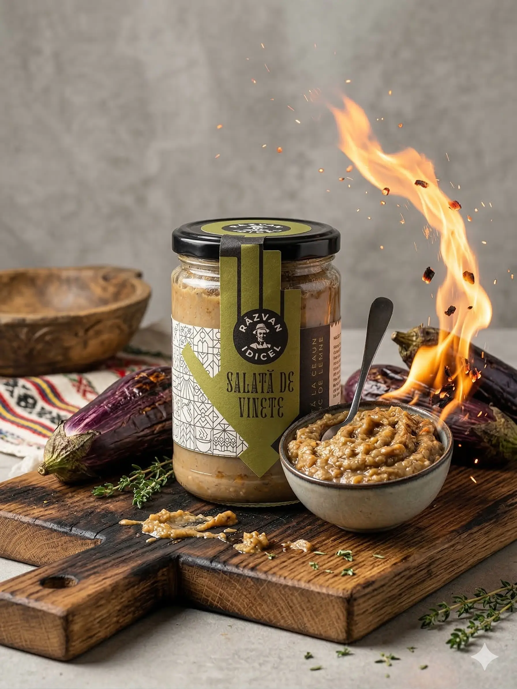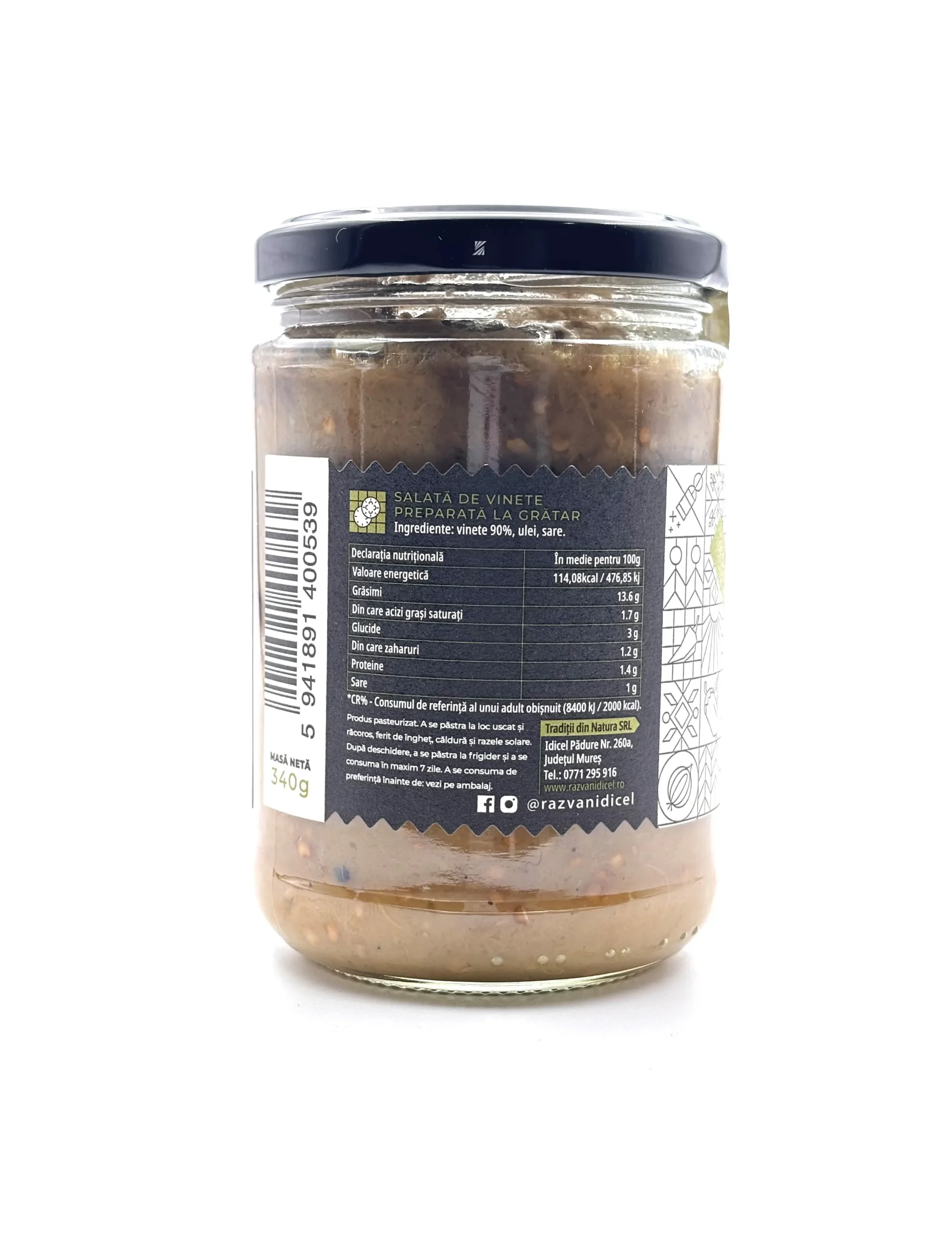 Producator: Razvan Idicel, Ingrediente principale: Vinete, ulei, sare, Tip produs: Salata de vinete, Gramaj: 350 g, Origine: Romania, Fara conservanti: Da, 100% natural: Da, Vegan: Da, Preparat la gratar: Da