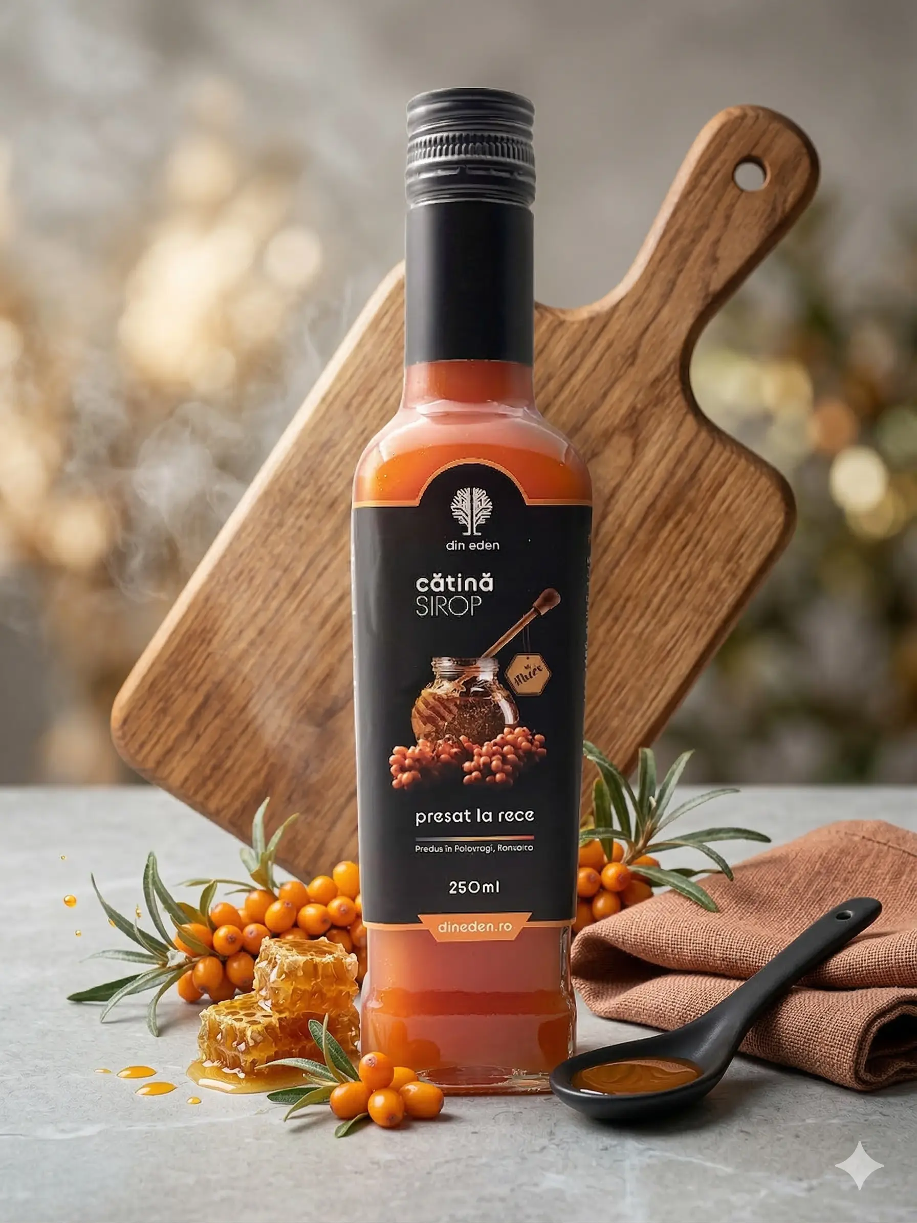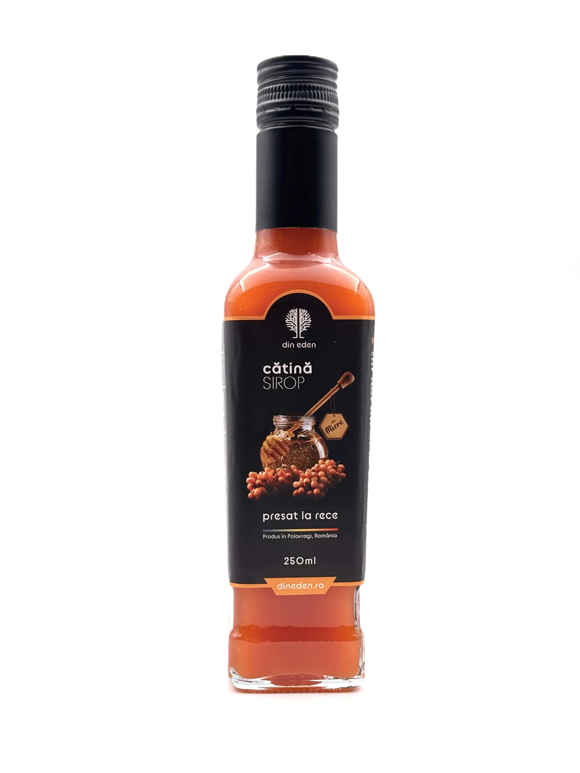 Producător: Din Eden, Ingrediente principale: suc natural din cătină presat la rece, miere polifloră naturală, Tip produs: Sirop de cătină cu miere, Cantitate: 250 ml, Origine: România, Fără conservanți: Da, 100% natural: Da, Mod de consum: Diluat cu apă plată sau minerală, consumat ca atare, utilizat în ceaiuri sau smoothie-uri, Beneficii: Bogat în vitamine, antioxidant natural, întărește imunitatea, Gust: Acrișor-dulce, intens fructat