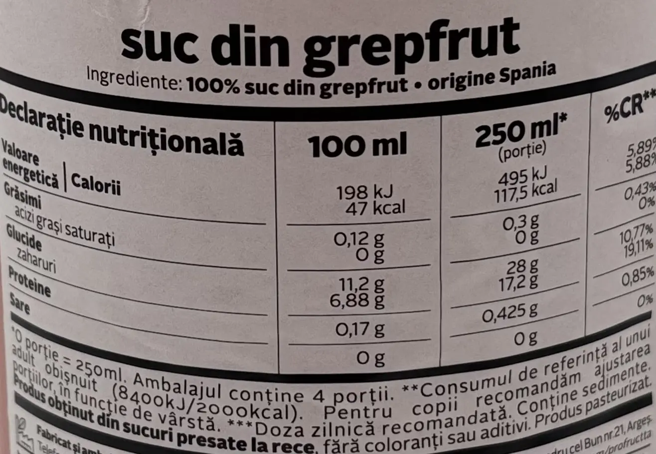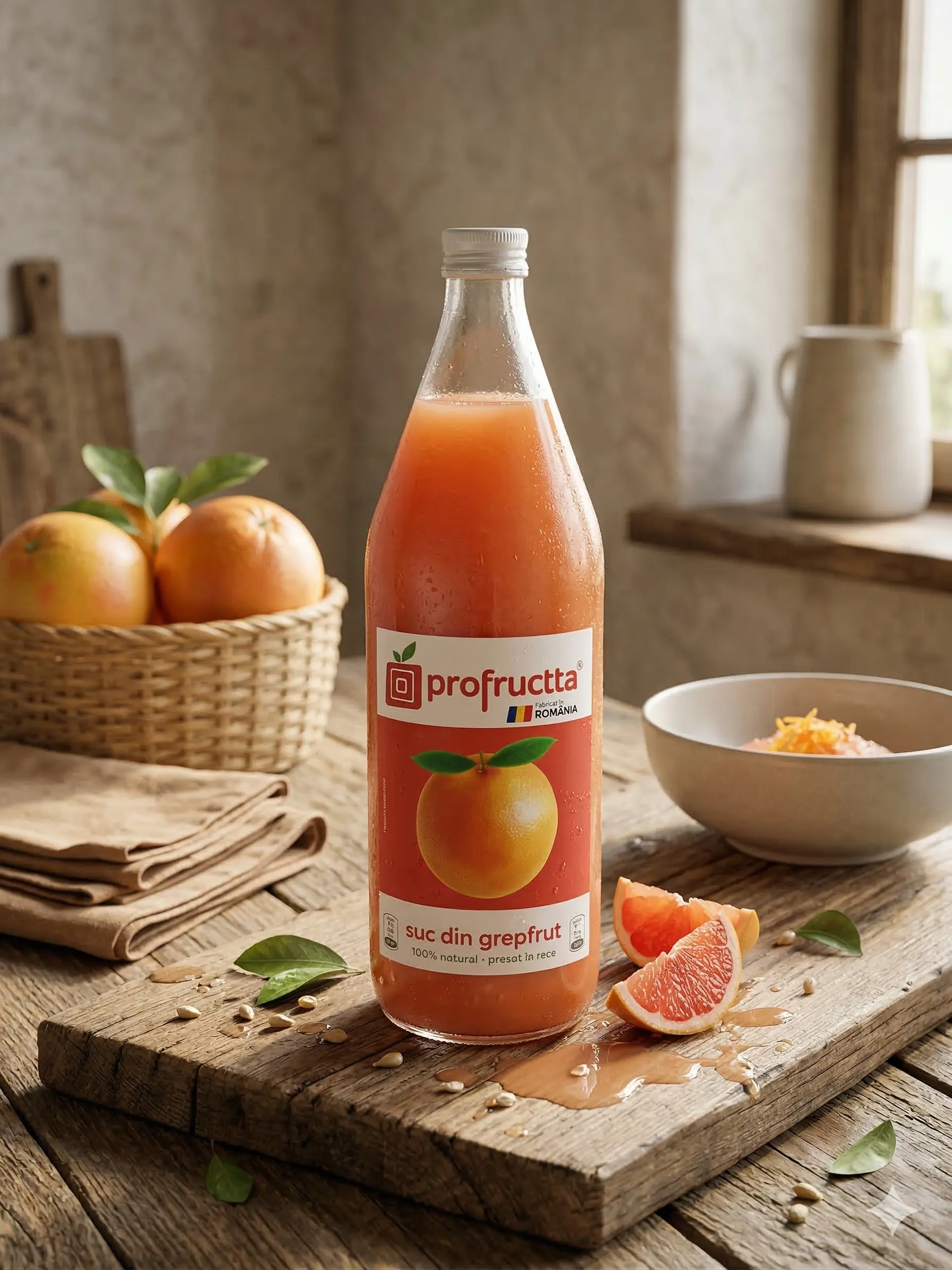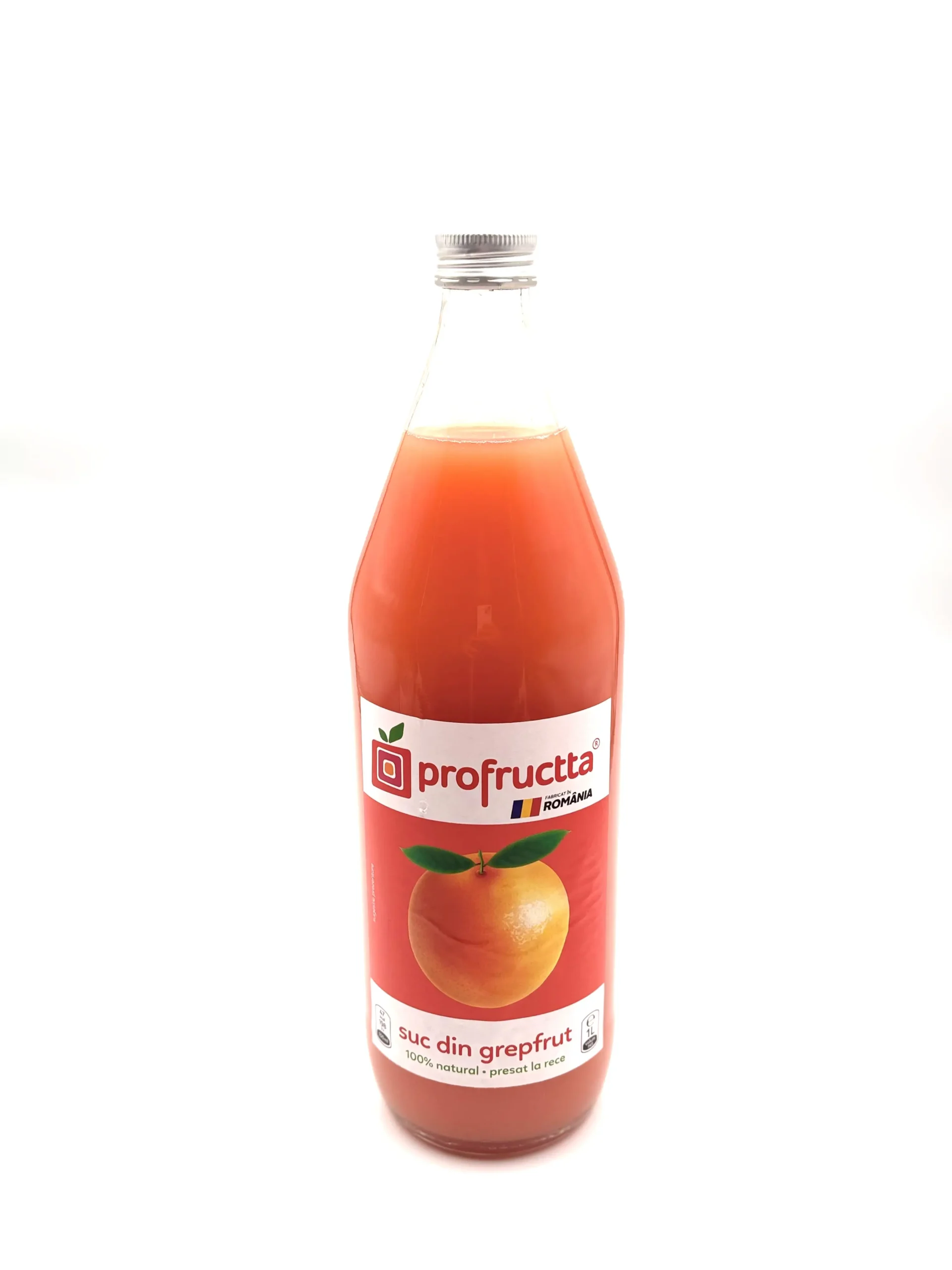 Producător: Profructta, Nume produs: Suc din grepfrut, Ingrediente principale: suc natural din grepfrut, Volum: 1000 ml, Tip produs: suc natural, Categorie: băutură naturală / suc de citrice, Gust dominant: acrișor-amărui, revigorant, Certificare: fără zahăr adăugat, fără conservanți, Beneficii: bogat în vitamina C, sprijină imunitatea, antioxidant, stimulează digestia, Procesare: presat la rece / pasteurizat blând, Ambalare: sticlă de 1 litru, Pretul afisat nu contine garantia SGR in valoare de 0,50 lei
