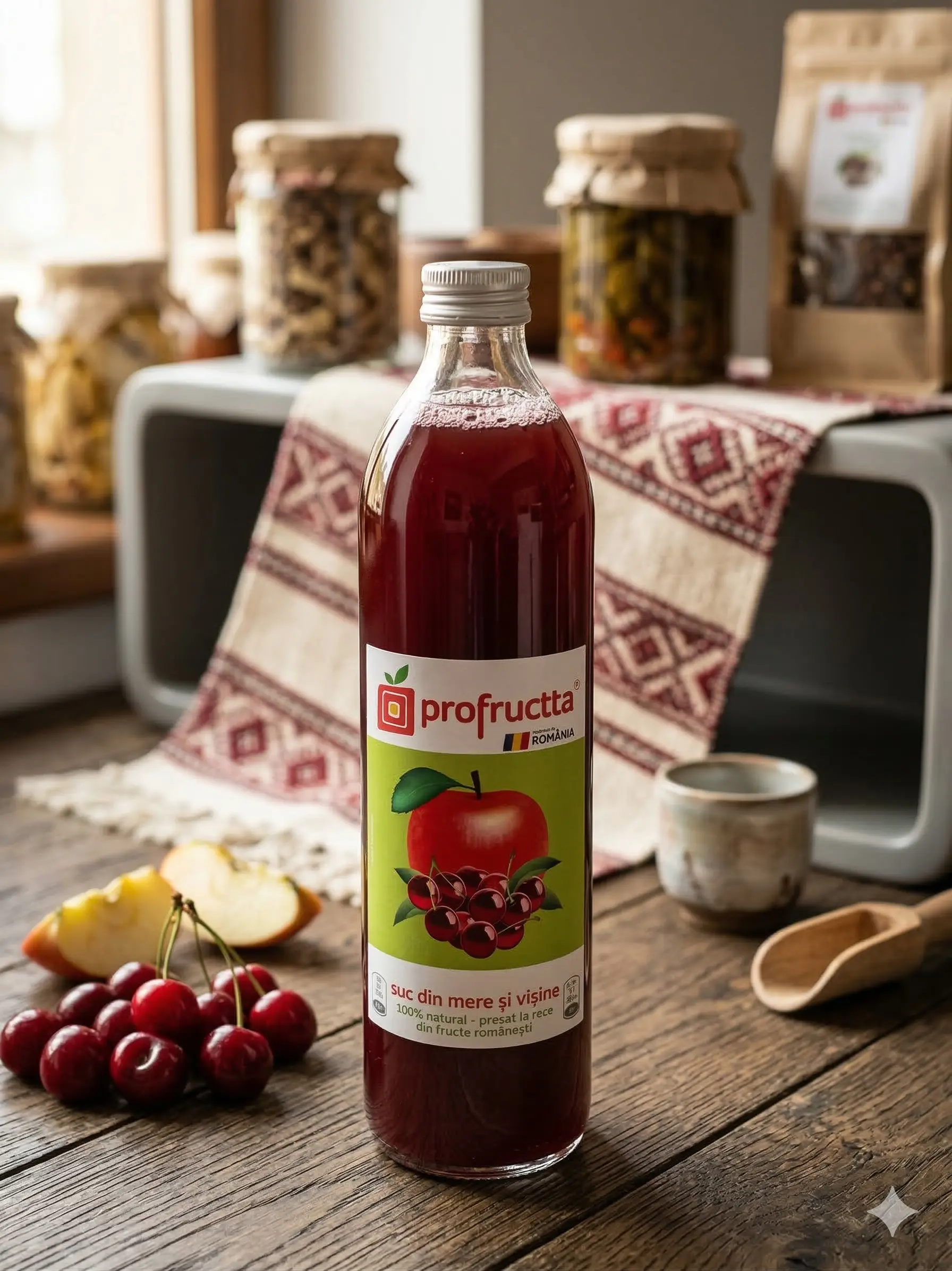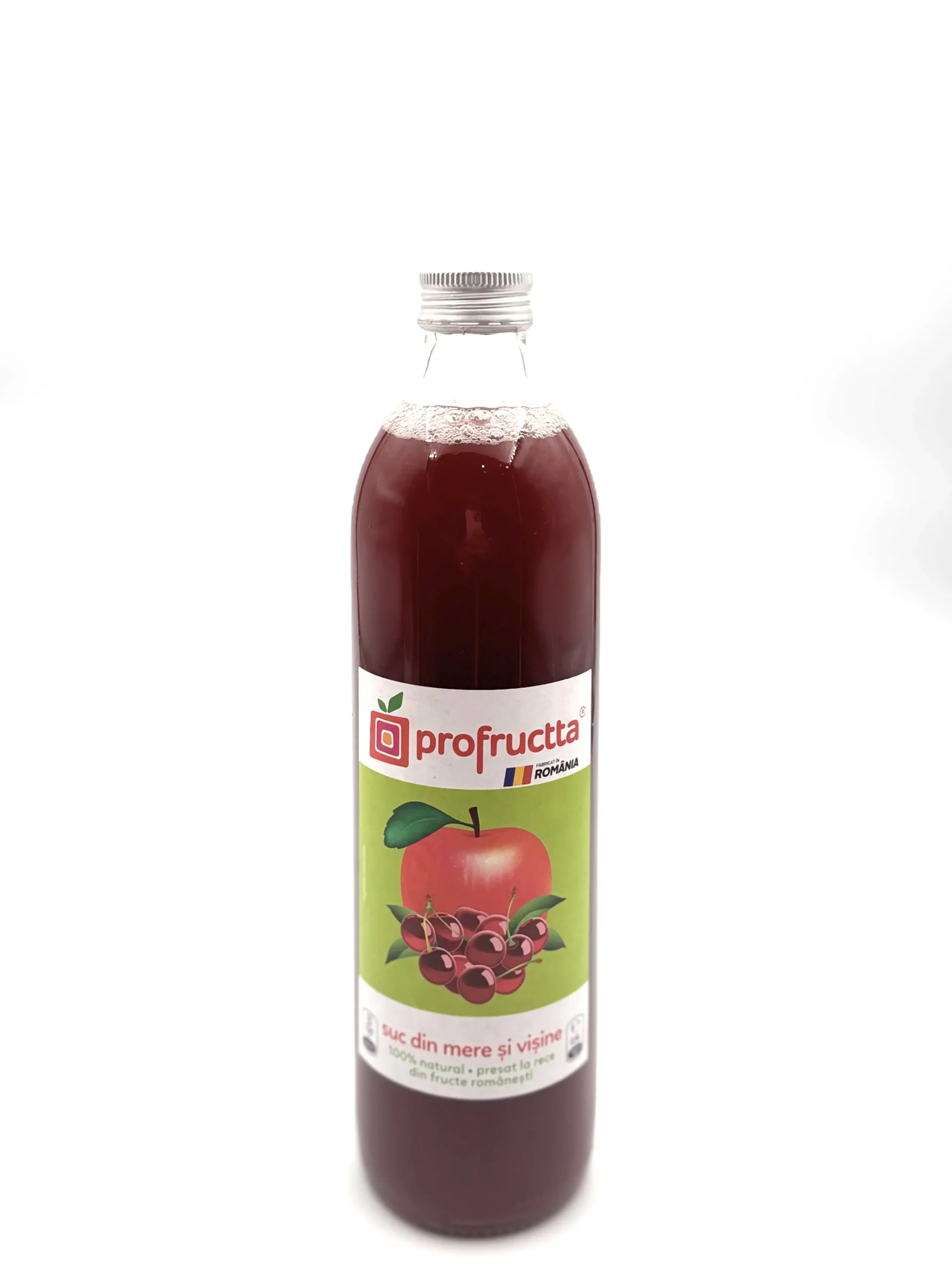 Producător: Profructta, Nume produs: Suc din mere și vișine, Ingrediente principale: suc din mere (75%), suc de vișine (25%), Volum: 500 ml, Tip produs: suc natural, Categorie: băutură naturală / suc de fructe, Gust dominant: dulce-acrișor, ușor astringent, Certificare: fără adaos de zahăr, coloranți sau conservanți, Beneficii: sursă de antioxidanți, vitamina C, hidratant și energizant, Procesare: presat la rece / pasteurizat ușor (după caz), Ambalare: sticlă de 500 ml, Pretul afisat nu contine garantia SGR in valoare de 0,50 lei