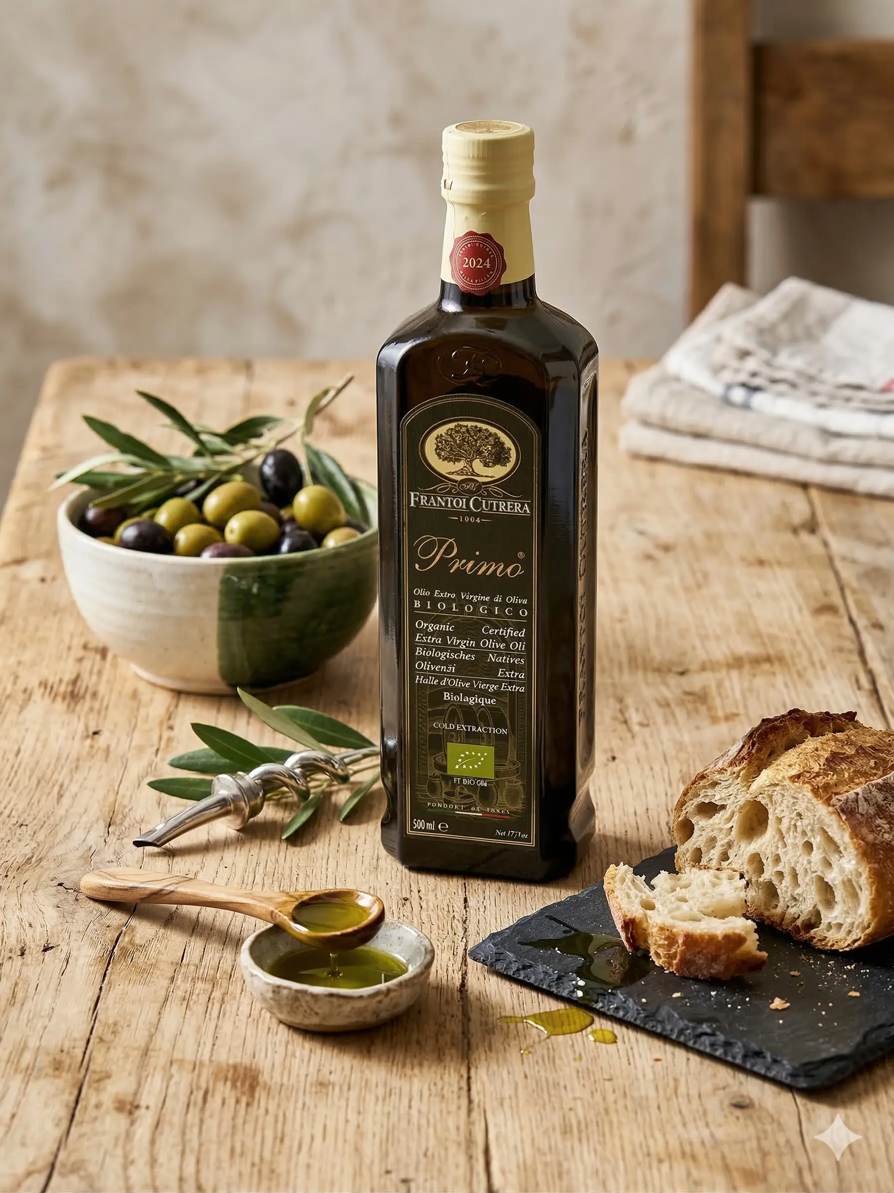 | Ulei de măsline extravirgin Frantoi Cutrera | Producător: Frantoi Cutrera, Origine: Italia, Ingrediente principale: ulei de măsline ecologic presat la rece, Tip produs: Ulei de măsline extravirgin, Certificare: Ecologic (Organic), Gramaj: 500 ml, Metodă de obținere: Presare la rece, Fără aditivi: Da, 100% natural: Da, Mod de consum: Ideal pentru salate, bruschete, paste, preparate mediteraneene, Beneficii: Bogat în acizi grași mononesaturați, polifenoli și antioxidanți, susține sănătatea cardiovasculară, Gust: Aromă intensă, note erbacee, ușor picant, cu accente de migdale și roșii verzi |