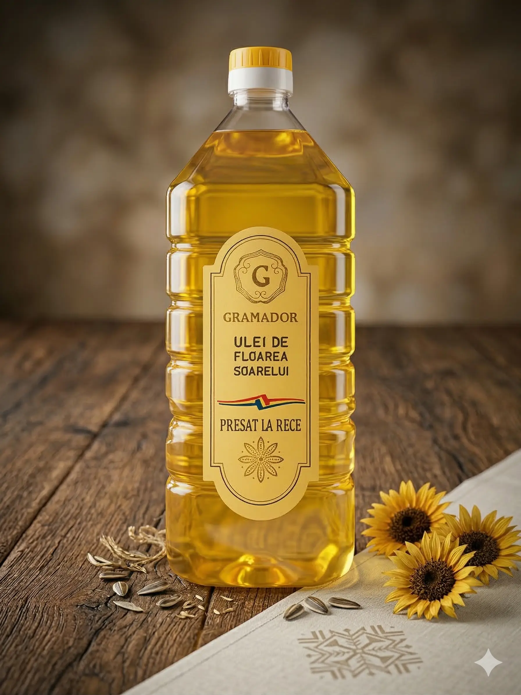 | Ulei din semințe de floarea-soarelui obținut prin presare la rece Gramador | Producător: Gramador, Ingrediente principale: ulei din semințe de floarea-soarelui obținut prin presare la rece, Tip produs: Ulei presat la rece, Gramaj:1000 ml, Metodă de obținere: Presare la rece, Fără aditivi: Da, 100% natural: Da, Mod de consum: Potrivit pentru salate, sosuri, gătit la temperaturi reduse, Beneficii: Bogat în acizi grași esențiali, sursă de vitamina E, contribuie la sănătatea inimii, Gust: Ușor dulceag, cu aromă naturală de semințe de floarea-soarelui |