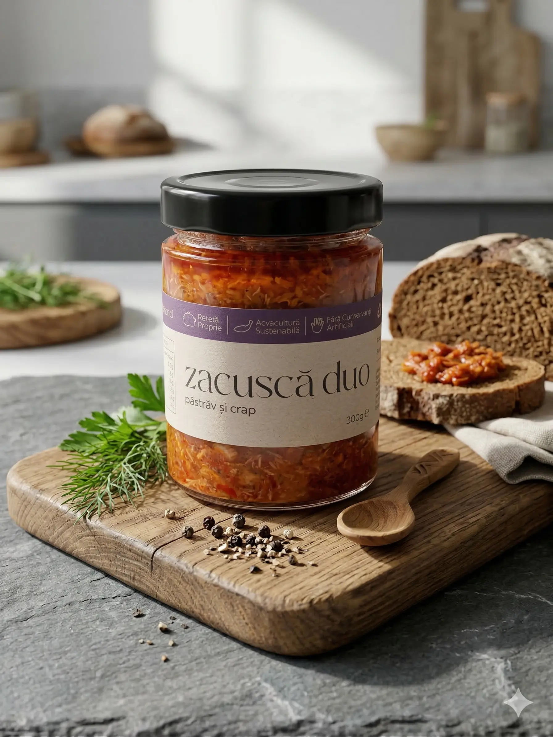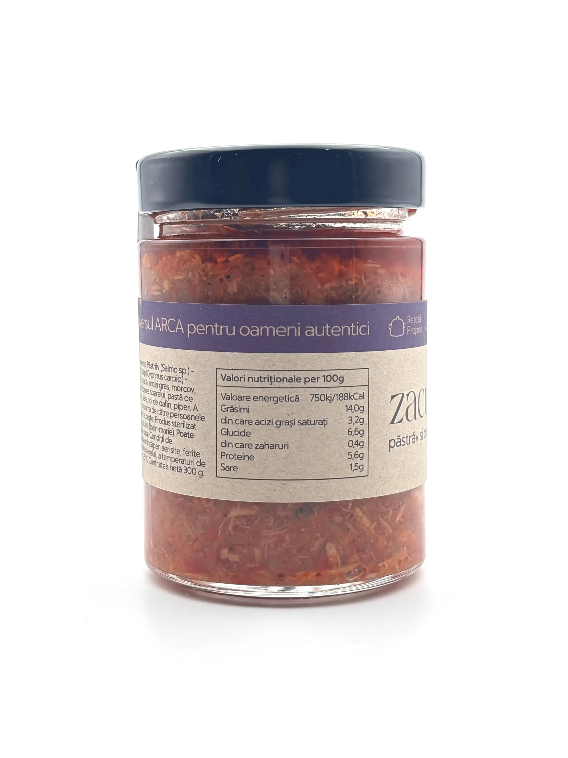 | Zacusca duo pastrav si crap Arca | Producator: Arca, Ingrediente principale: Pastrav, crap, ceapa, ardei gras, morcov, ulei de floarea soarelui, pasta de tomate, sare, foi de dafin, piper, Tip produs: Zacusca duo pastrav si crap, Gramaj: 300 g, 100% natural: Da, Fara aditivi: Da, Reteta traditionala: Da, Textura: Crema cu bucati fragede de peste si legume, Aroma: Gust echilibrat si bogat de pastrav si crap gatit lent cu legume aromate, Mod de consum: Se serveste pe paine proaspata sau prajita, ca aperitiv sau gustare, Beneficii: Sursa naturala de proteine, acizi grasi Omega-3, ingrediente naturale fara conservanti |