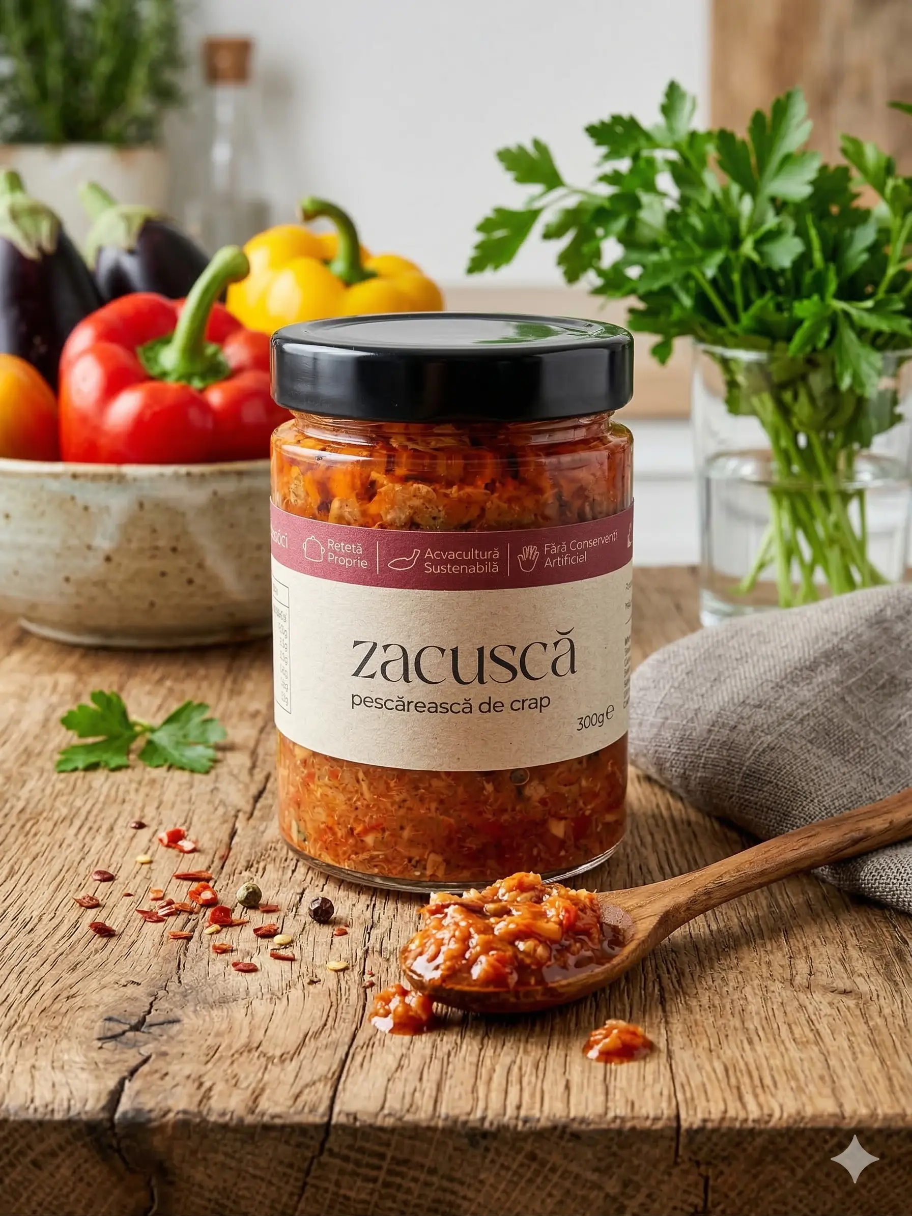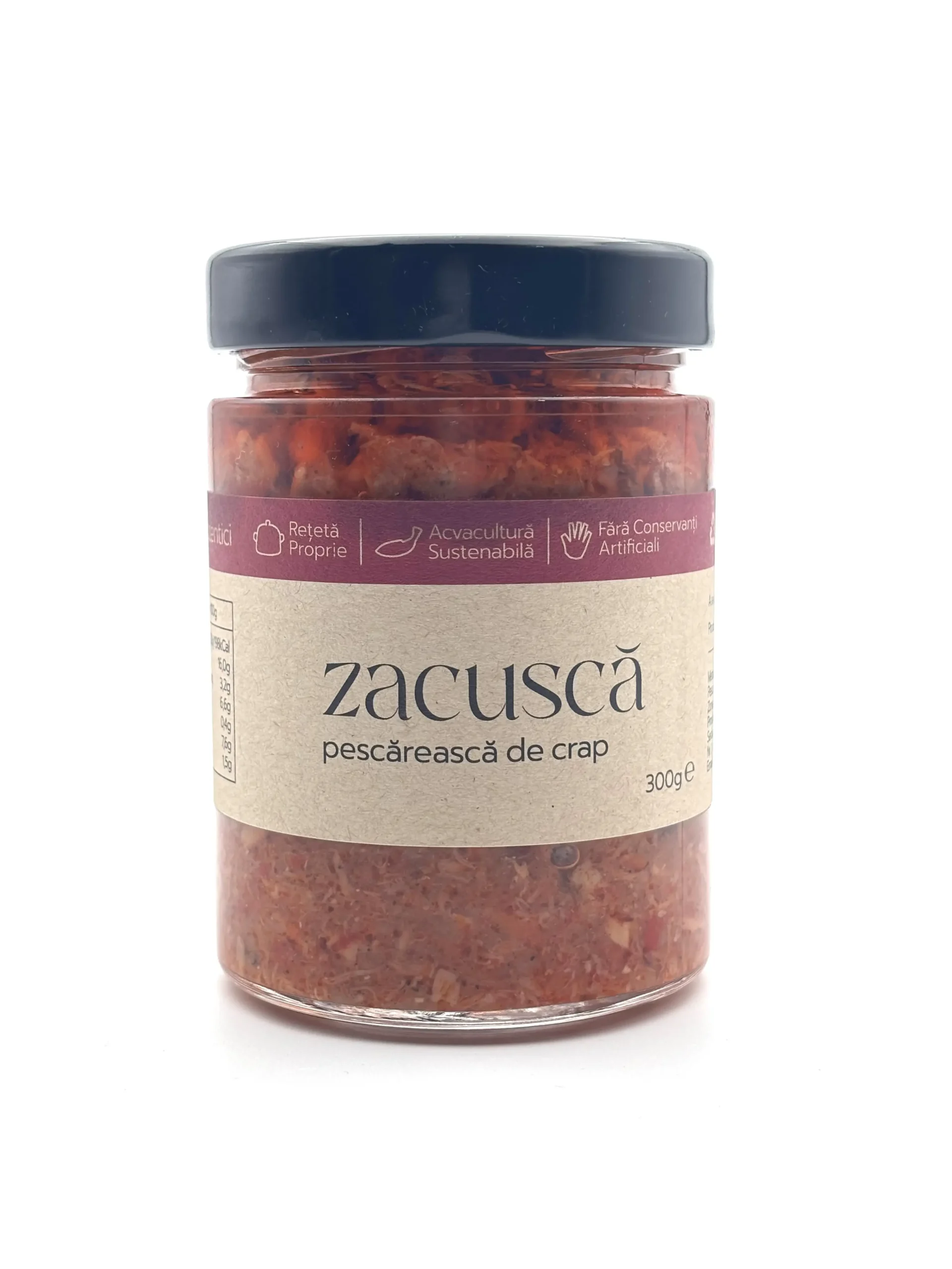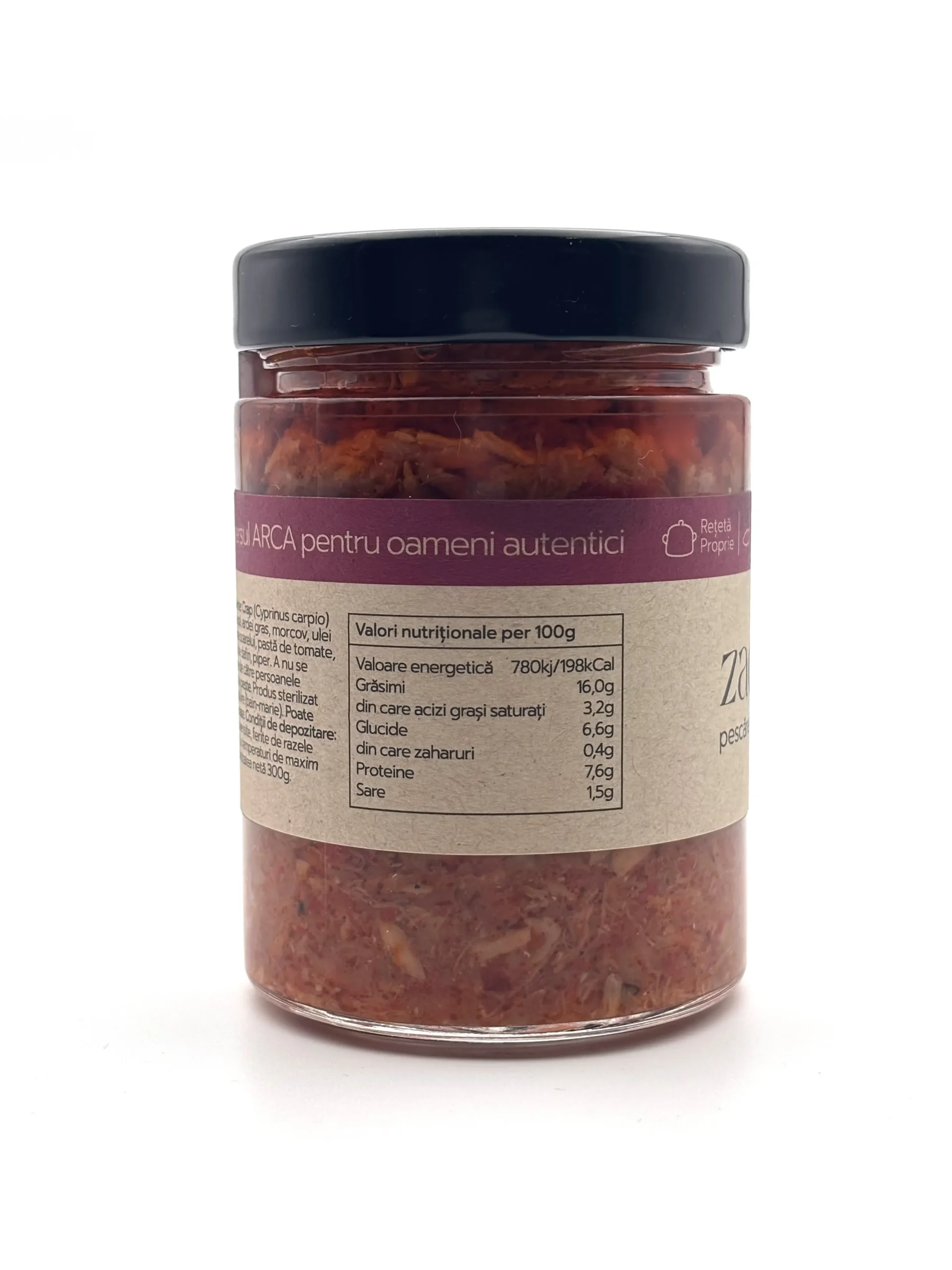 | Zacusca pescareasca din crap Arca | Producator: Arca, Ingrediente principale: Crap, ceapa, ardei gras, morcov, ulei de floarea soarelui, pasta de tomate, sare, foi de dafin, piper, Tip produs: Zacusca pescareasca din crap, Gramaj: 300 g, 100% natural: Da, Fara aditivi: Da, Reteta traditionala: Da, Textura: Crema cu bucati fragede de peste si legume, Aroma: Gust bogat si echilibrat de crap gatit lent cu legume aromate, Mod de consum: Se serveste pe paine proaspata sau prajita, ca aperitiv sau gustare, Beneficii: Sursa naturala de proteine, acizi grasi Omega-3, ingrediente naturale fara conservanti |